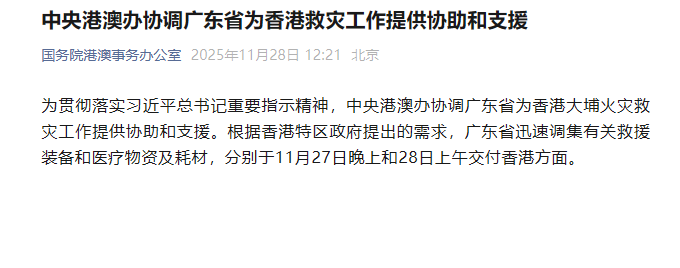 為貫徹落實(shí)習(xí)近平總書記重要指示精神,中央港澳辦協(xié)調(diào)廣東省為香港大埔火災(zāi)救災(zāi)工作提供協(xié)助和支援。根據(jù)香港特區(qū)政府提出的需求,廣東省迅速調(diào)集有關(guān)救援裝備和醫(yī)療物資及耗材,分別于11月27日晚上和28日上午交付香港方面。