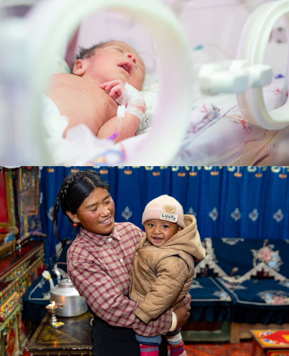 拼版照片:上圖為2025年1月9日,地震中第一個出生的“地震寶寶”次仁拉巴(1月8日7時40分左右出生)在日喀則市人民醫(yī)院新生兒科病房睡覺。下圖為2025年11月11日,次仁拉巴和媽媽強瓊在新房里。