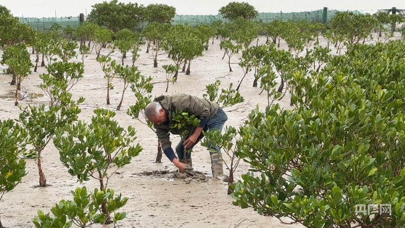 吳昌根輕輕地將灘涂上倒伏的紅樹幼苗扶正(央廣網記者 李曉曉 攝)