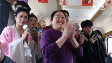 車廂里,國家級非遺沾化漁鼓戲現場開唱。旅客們都圍攏過來,在回家的路上聽了一段地道年戲。