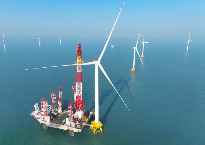 2026年1月13日在福建閩南海域拍攝的“大橋海風”號2000噸自升式海上風電安裝平臺和20兆瓦風電機組吊裝現場(無人機照片)。