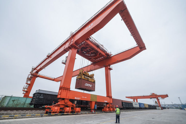 2026年1月30日,在義烏鐵路口岸,一列載著進口商品的中歐班列回程班列在卸貨。