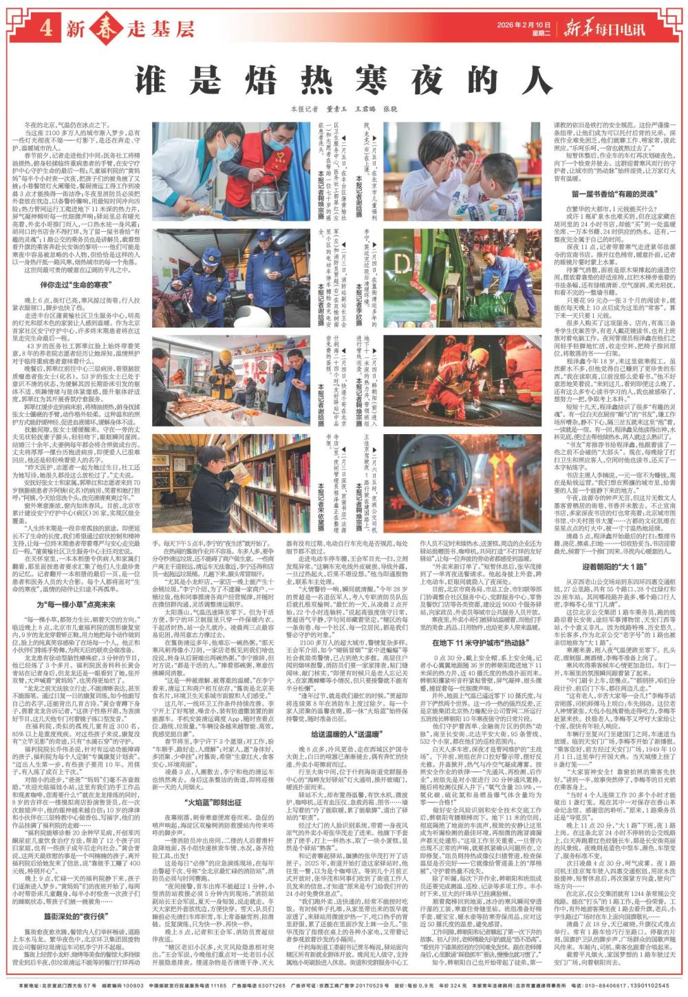 春節前夕,記者走進他們中間:醫務社工將精油搓熱,俯身輕揉臨終重病患者的手臂,在安寧療護中心守護生命的最后一程;兒童福利院的“黃媽媽”每半個小時查一次夜,把孩子們的被角掖了又掖;小巷餐館燈火闌珊處,餐廚清運工得工作到凌晨3點才能換得一街潔凈;冬夜里消防員必須把外套放在枕邊,以備警鈴驟響,用最短時間沖向兇險;熱力管網運行工爬進地下11米深的熱力井,屏氣凝神傾聽每一絲細微聲響;驛站里總有暖光亮著,外賣小哥推門而入,一口熱水祛一身風霜;胡同口的書店舍不得打烊,為了留一屋書香給“有趣的靈魂”;1路公交的乘務員也是講解員,載著想看升旗的乘客奔赴長安街的黎明……他們可能是寒夜中容易被忽略的小人物,但恰恰是這樣的人以一身熱汗抵一路風寒,焐熱城市的每一個角落。