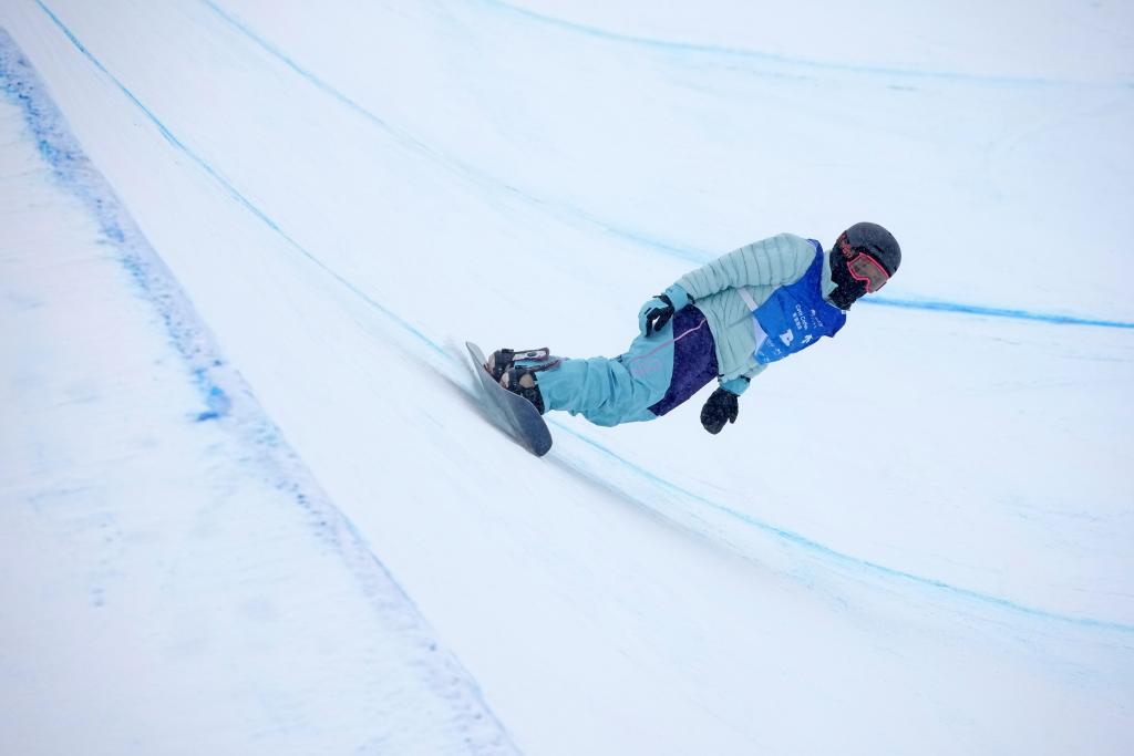 2025年12月12日,中國選手蔡雪桐在比賽中。當日,單板滑雪U型場地技巧世界杯女子組決賽在河北省張家口市崇禮區舉行。新華社記者 王鵬 攝