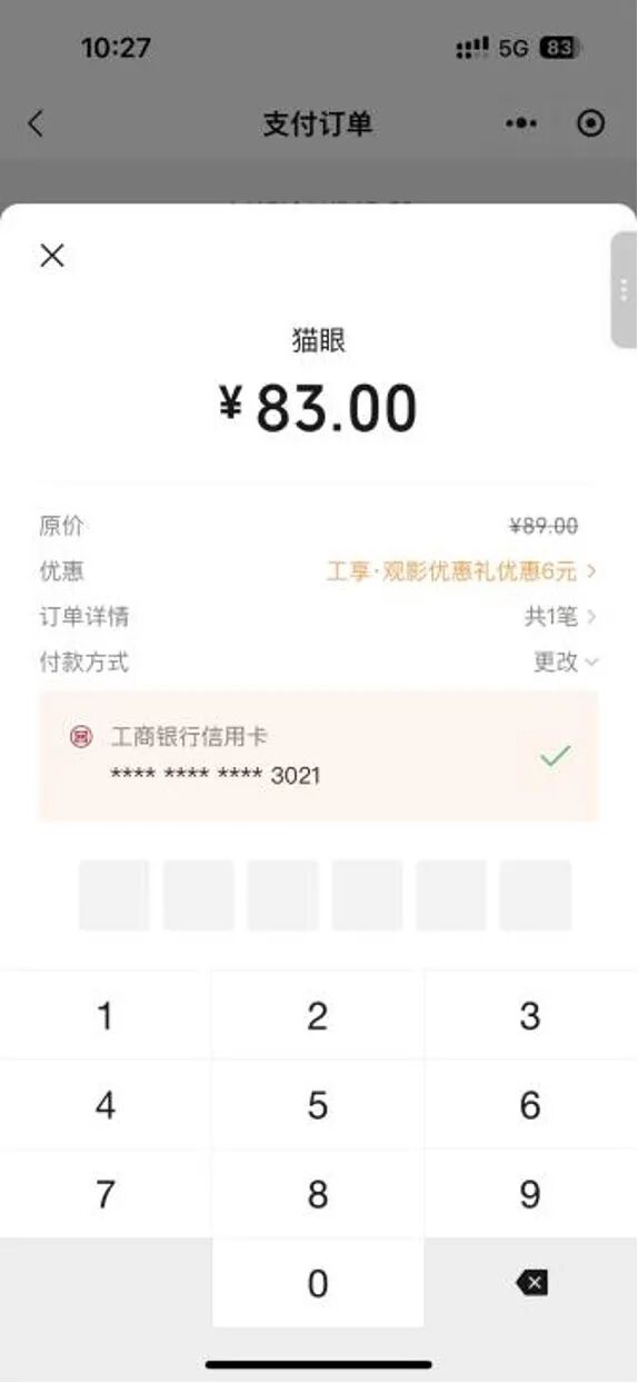 登錄貓眼App或微信小程序,進入電影頻道,進行影院/影票/場次選擇,隨后進入訂單頁,確認后選擇用微信支付,并用綁定的工行卡結(jié)賬可確認最終優(yōu)惠信息(用戶在此步驟才能看到實際優(yōu)惠)。