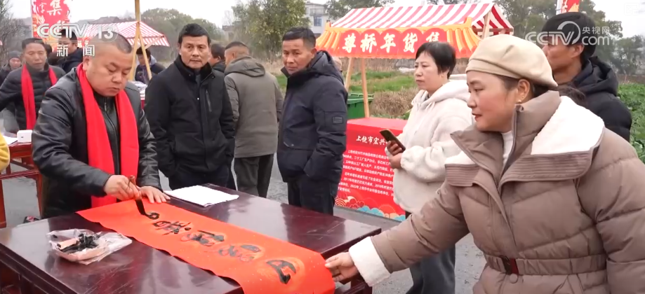 在江西上饒市廣信區尊橋鄉,年貨市集人頭攢動。攤位上年貨品類豐富,當地的書法愛好者現場寫春聯、送福字,墨香四溢。