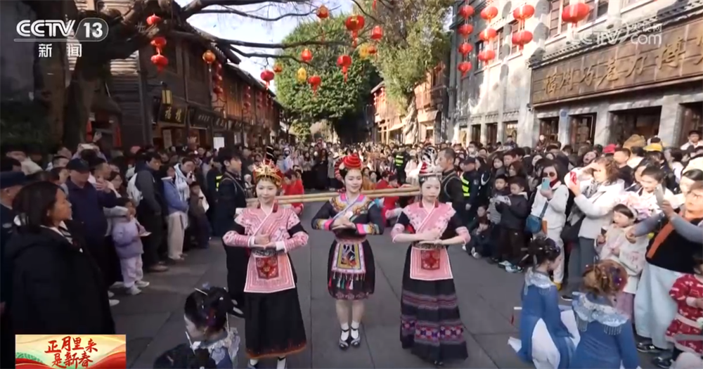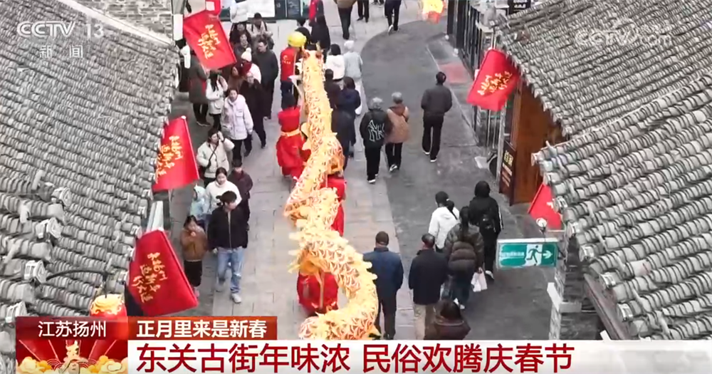 我們現在看到的是江蘇揚州東關歷史文化街區。春節假期,東關城門之下,舞龍表演熱鬧開場,金龍翻騰跳躍、氣勢昂揚,鏗鏘有力的音樂此起彼伏,引得市民游客紛紛駐足圍觀、拍手叫好,將新春的喜慶氛圍推向高潮。