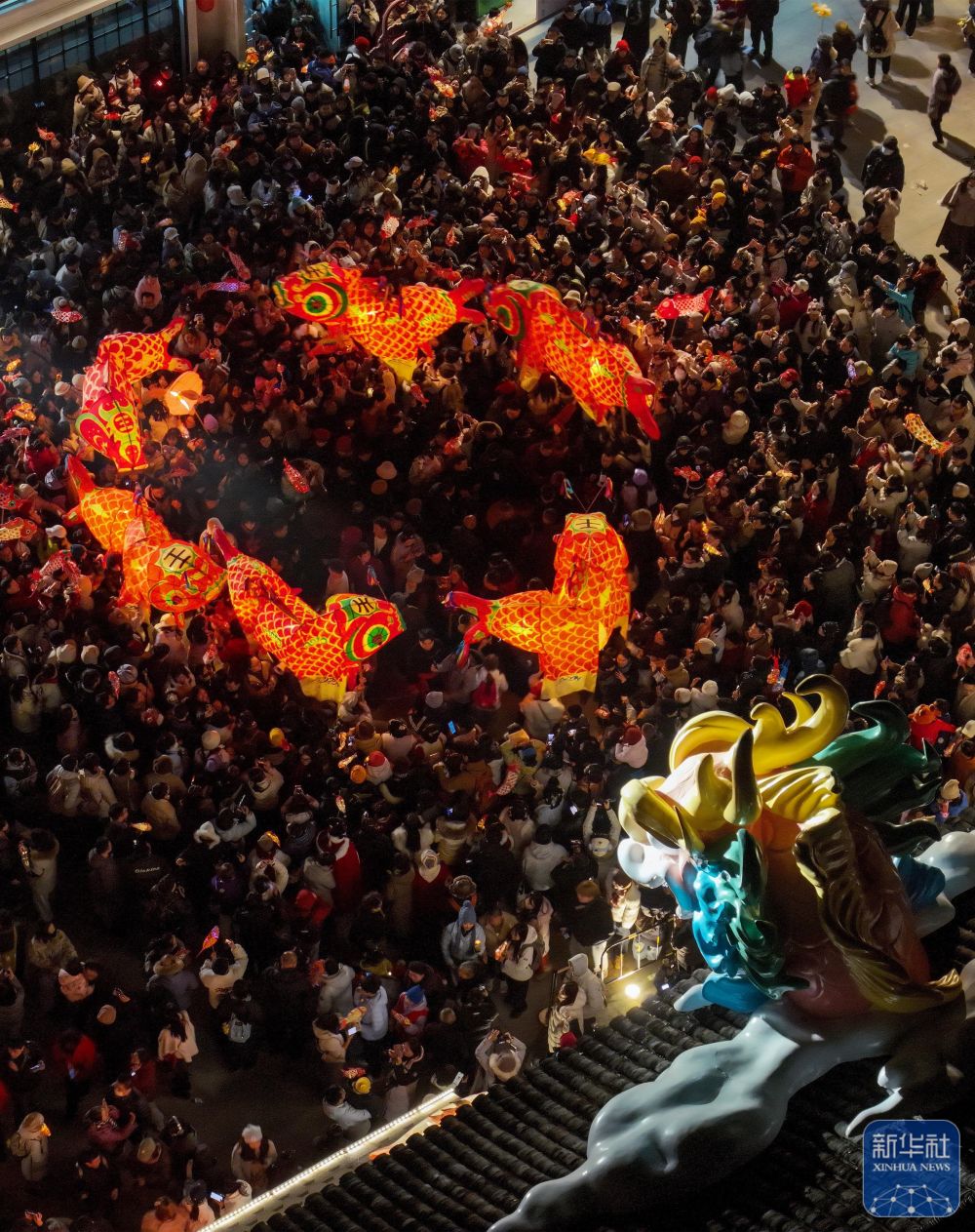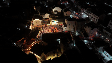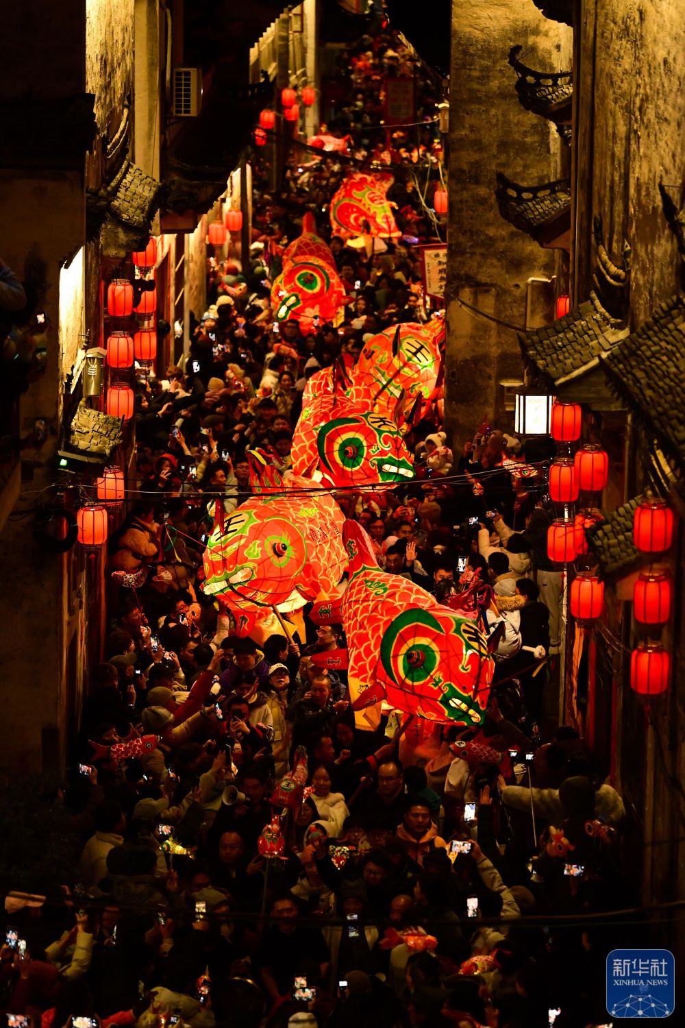 2月7日,瞻淇村魚燈隊在村中表演(無人機(jī)照片)。