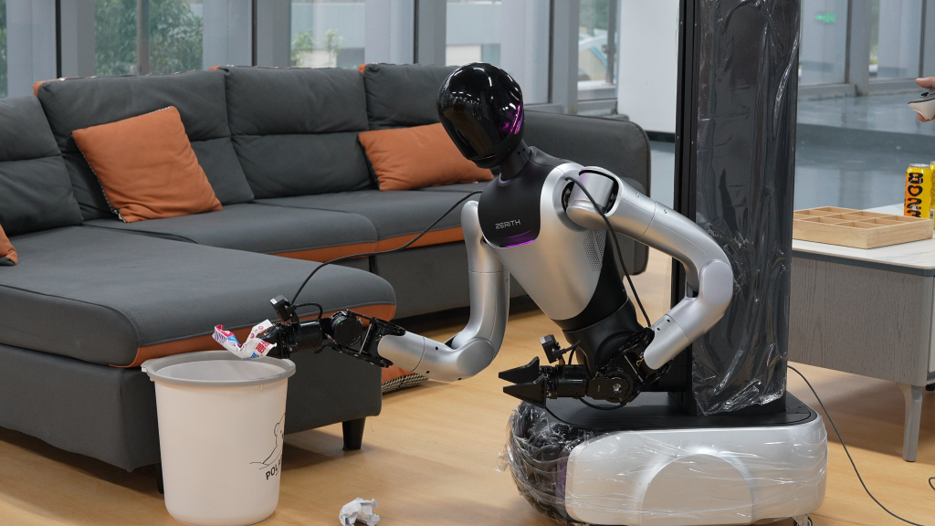 隨著人工智能和具身智能技術(shù)的加速演進(jìn),更具前瞻性的“AI+服務(wù)”探索正在開展。在合肥零次方機(jī)器人有限公司,研發(fā)人員在公共衛(wèi)生間復(fù)刻場(chǎng)景中,訓(xùn)練一款輪臂人形機(jī)器人完成擦桌子、清潔馬桶、疊衣服、使用吸塵器打掃衛(wèi)生等任務(wù)。