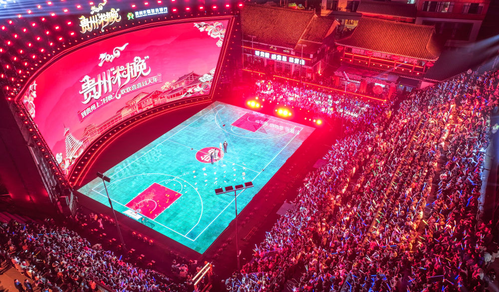 2026年2月3日,觀眾在貴州省臺江縣臺盤鄉“村BA”球場觀看貴州“村晚”(無人機照片)。