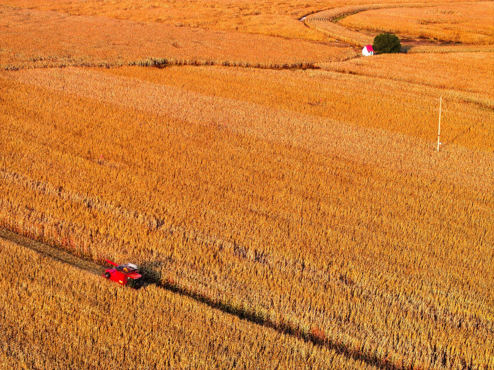 農機手駕駛收割機在內蒙古自治區通遼市科爾沁區豐田鎮收割玉米(2025年10月14日攝,無人機照片)。“十四五”時期,糧食總產量由2021年的1.37萬億斤增至2025年的1.43萬億斤,連續兩年站穩在1.4萬億斤的臺階。