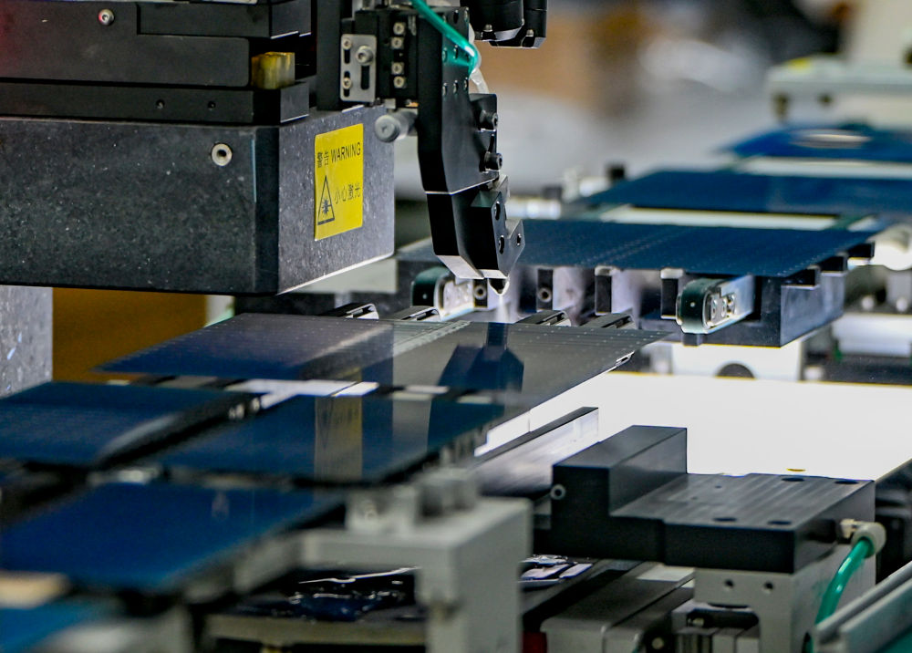 在新疆巴音郭楞蒙古自治州若羌縣一家新能源有限公司,全自動劃片機在切割光伏電池片(2025年9月22日攝)。“十四五”期間,電動汽車、光伏產品、鋰電池等“新三樣”產品2025年出口規模接近1.3萬億元,比2020年增長3.5倍。