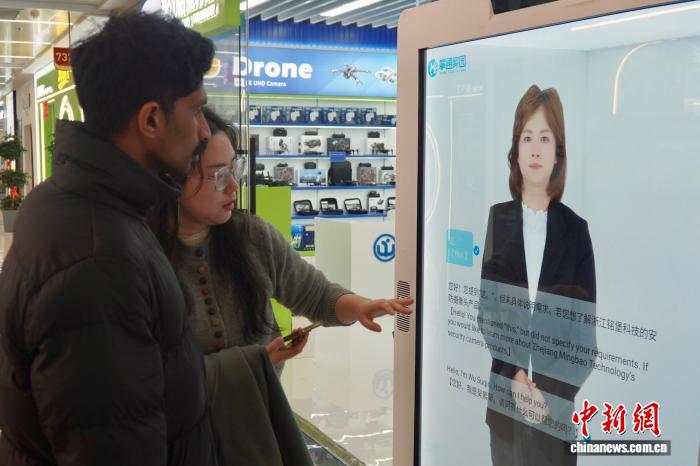 2月28日,浙江義烏,中外客商在店鋪門前與多語種數字人對話。董易鑫 攝