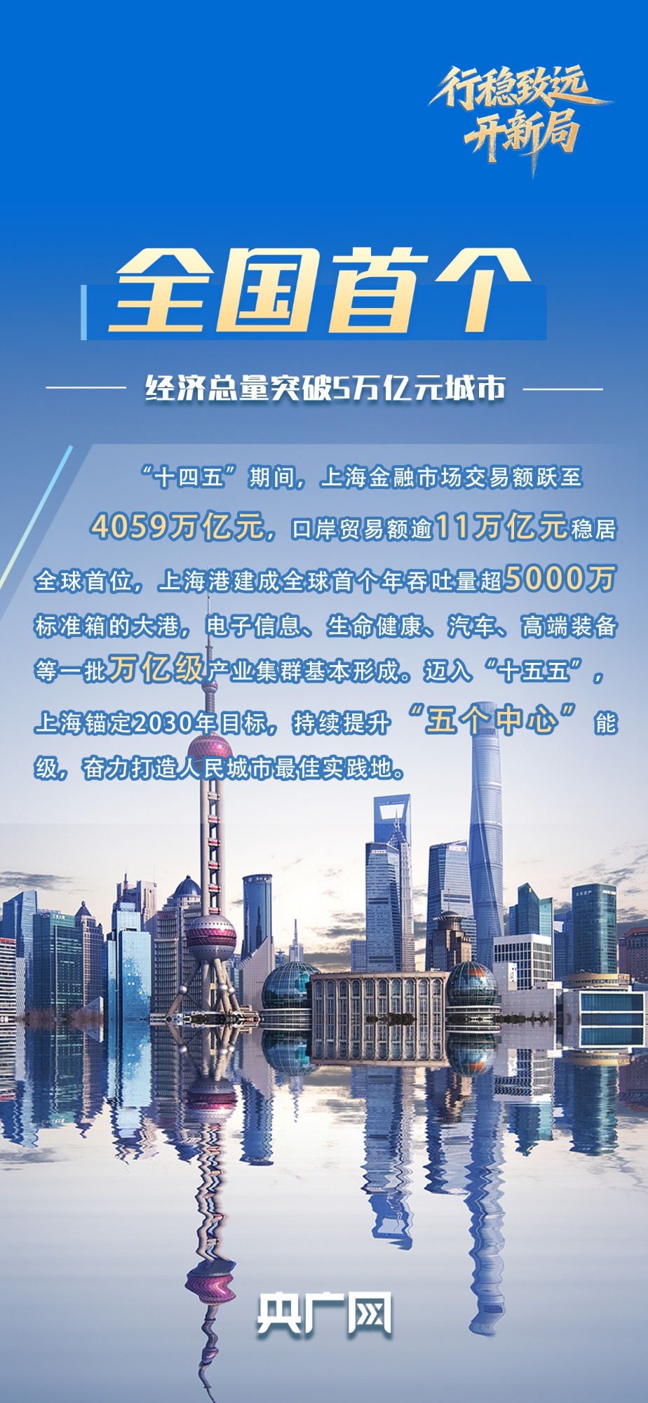 “十四五”期間,上海聚焦建設(shè)國(guó)際經(jīng)濟(jì)中心、金融中心、貿(mào)易中心、航運(yùn)中心、科技創(chuàng)新中心的重要使命,綜合實(shí)力實(shí)現(xiàn)新跨越。全市生產(chǎn)總值從4.16萬(wàn)億元增加到5.67萬(wàn)億元,成為全國(guó)首個(gè)經(jīng)濟(jì)總量突破5萬(wàn)億元的城市,躋身全球城市前五位。成績(jī)單背后,既是上海“五個(gè)中心”建設(shè)的階段性成效,更是“十五五”期間邁向更高能級(jí)的底氣所在。