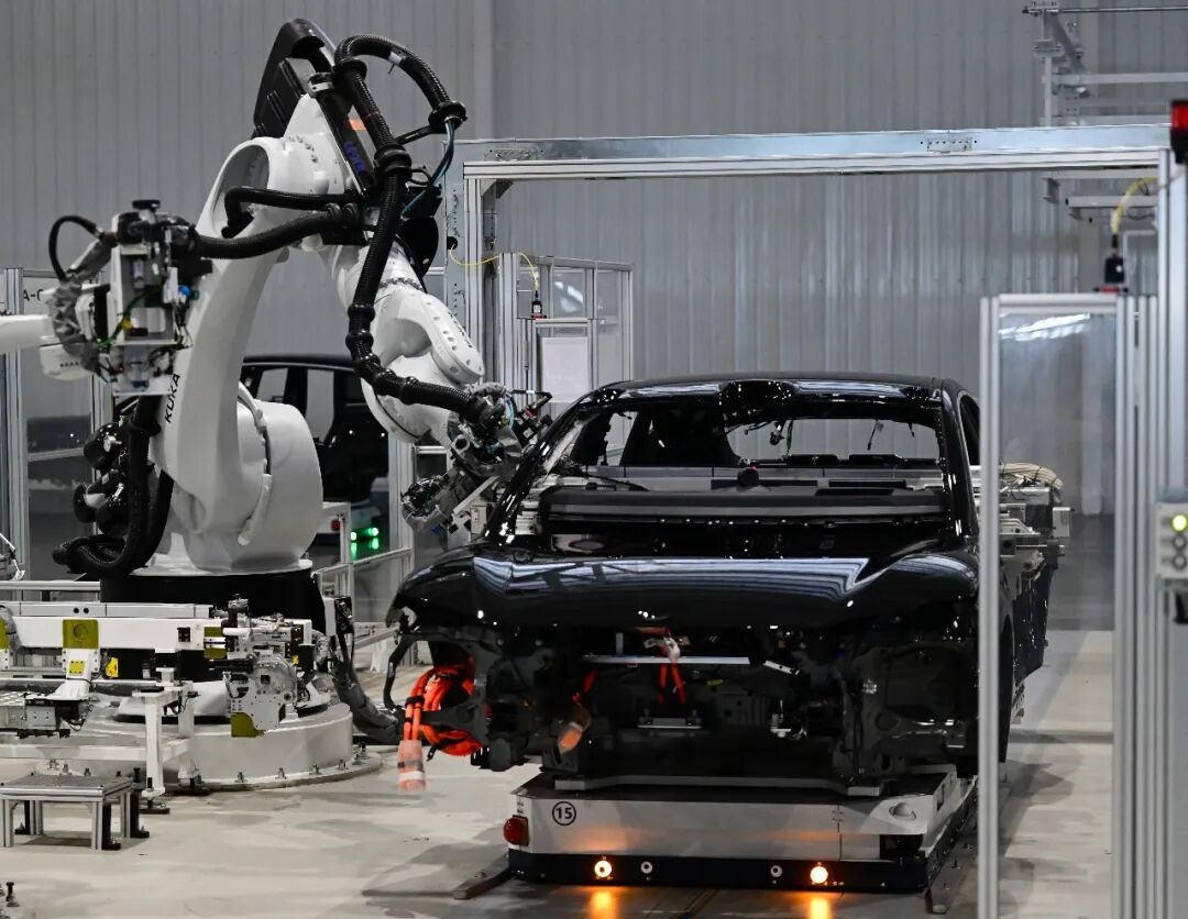 圖為記者在安徽合肥市新橋智能電動汽車產業(yè)園蔚來第二工廠拍攝的新能源汽車生產線。新華社記者周牧攝