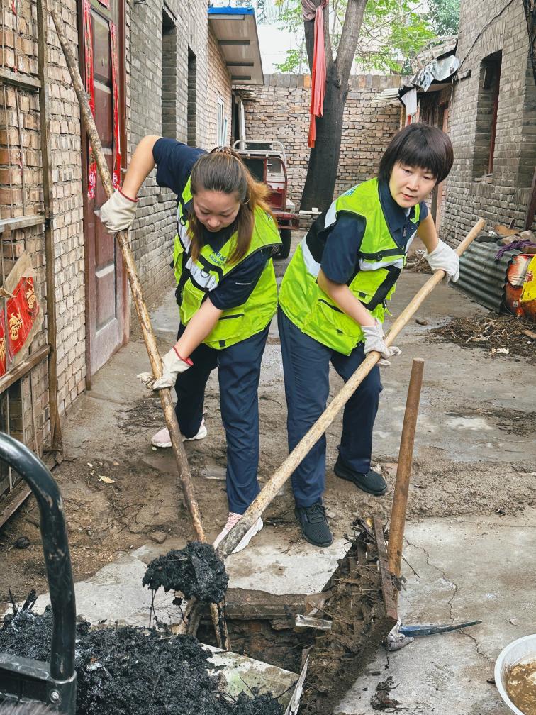 2025年7月,王潤梅(右)和同事在清掏下水井。(受訪者供圖)