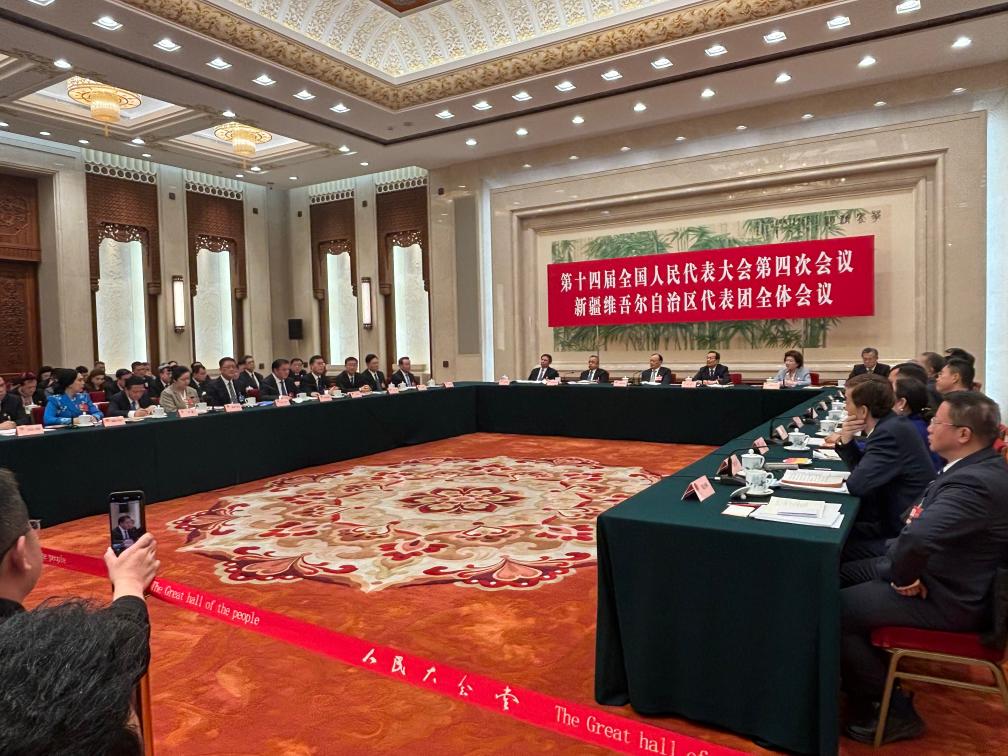 十四屆全國人大四次會議新疆維吾爾自治區代表團全體會議現場。新華社記者 劉雅萱 攝