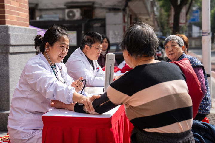 2026年3月5日,在湖南長沙市望城區高塘嶺街道雷鋒路社區雷鋒驛站,志愿者(左一)為市民測量血壓。新華社記者 陳思汗 攝