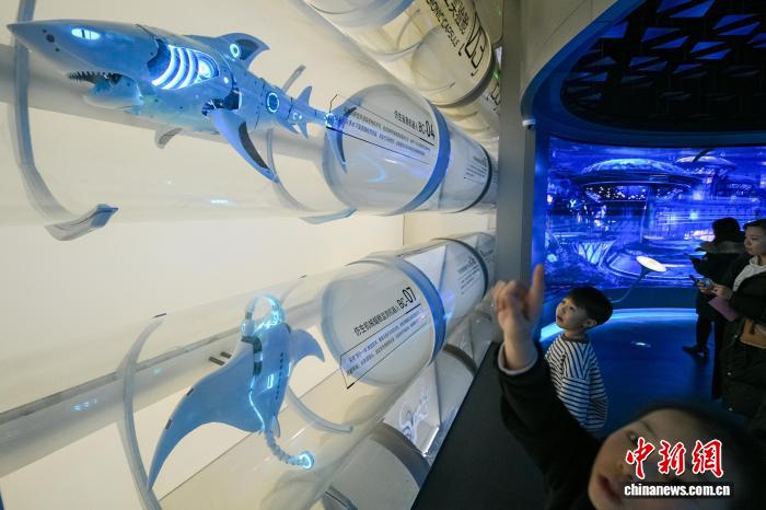 1月30日,游客在位于天津濱海新區的國家海洋博物館“未來海洋”展廳參觀各種海洋仿生機器人。 中新社記者 佟郁 攝
