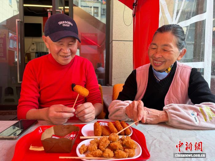 3月11日,臺胞劉韋麟(左)與妻子吳微微一邊品嘗自制的臺灣小吃一邊聊天。中新社記者 岳依桐 攝