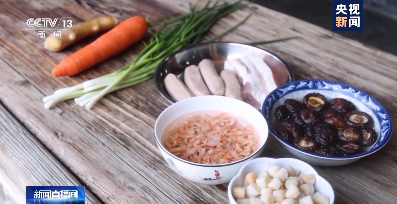 一邊蒸飯,一邊就可以準備配菜了,五花肉、香菇、干貝、胡蘿卜……這些色彩鮮艷的山珍海味都是芥菜飯的“靈魂”搭配。