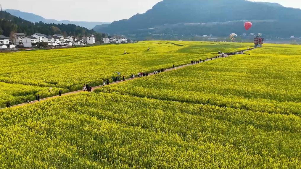 在平昌縣白衣鎮(zhèn),金色油菜花海與古鎮(zhèn)風(fēng)光相映成趣,吸引眾多游客前來踏青觀光。