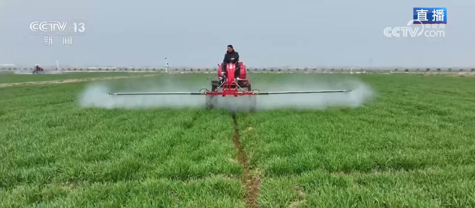 此時此刻,在麥田里,自走式植保機正在作業,今年的植保機加裝了北斗導航無人駕駛輔助系統,機器可以實現無人化操作。只要提前設定參數,機器就能夠完成自動轉彎、停車、噴灑等等作業流程,節約了人手,提高了效率。不僅僅是地面上,稍遠處的空中,無人機飛防作業正在另一片麥地的上空進行,它們正在為麥田播撒葉面肥。