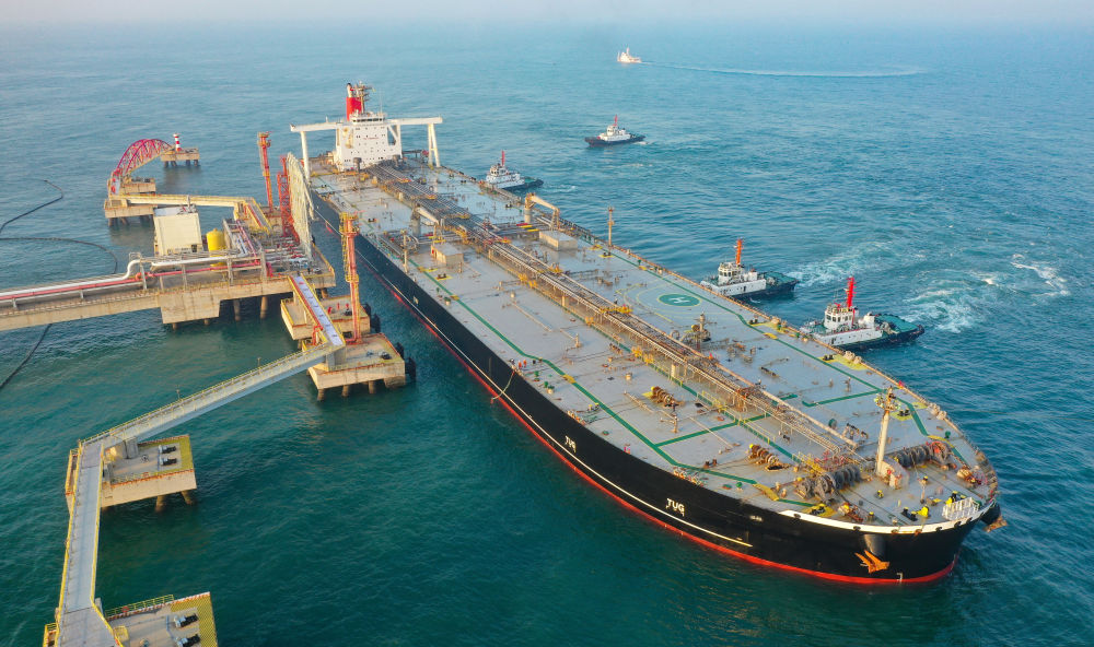 2025年12月18日,一艘裝載著石化原輔料的外籍船舶泊入位于海南省儋州市的國投洋浦油儲碼頭30萬噸級原油泊位(無人機照片)。當日,海南自由貿(mào)易港正式啟動全島封關(guān)。新華社記者 郭程 攝
