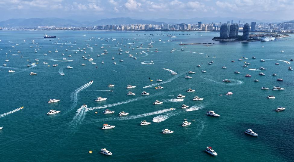 2月21日,游客在三亞乘船游玩(無人機照片)。新華社記者 趙穎全 攝