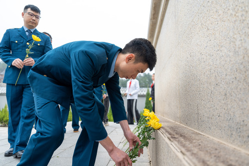 在莊嚴肅穆的烈士紀(jì)念碑前,全體人員向烈士英魂鞠躬默哀、敬獻菊花,表達對革命先烈的深切懷念和崇高敬意。