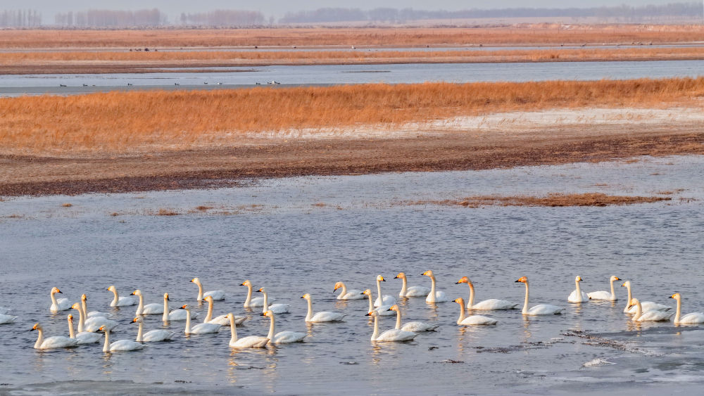北歸的天鵝在吉林省莫莫格國家級自然保護區(qū)內游弋。新華社發(fā)(潘晟昱 攝)