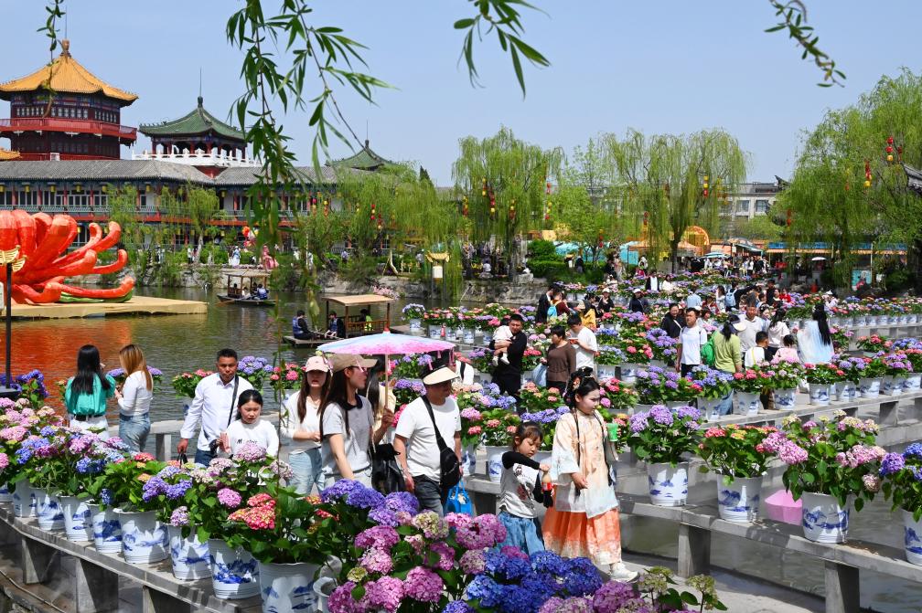 4月5日,游客在河南省開封市翰園碑林游覽玩耍。新華社發(李俊生攝)