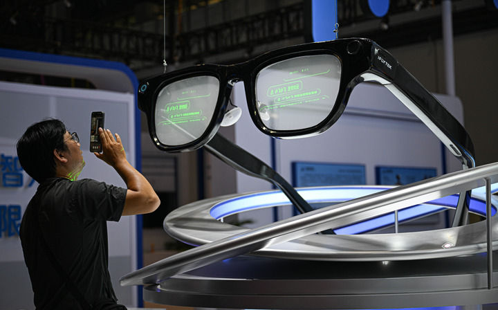 4月10日在第六屆消博會主會場拍攝的AI眼鏡模型。新華社記者蒲曉旭 攝