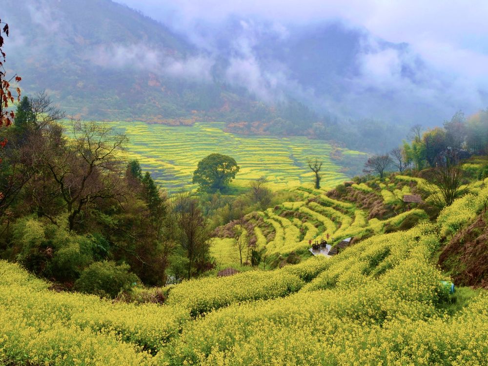 清晨的婺源江嶺景區,晨霧剛剛散去,萬畝梯田便在春光里鋪展開來,金黃的油菜花順著山勢層層疊疊涌向山腳。