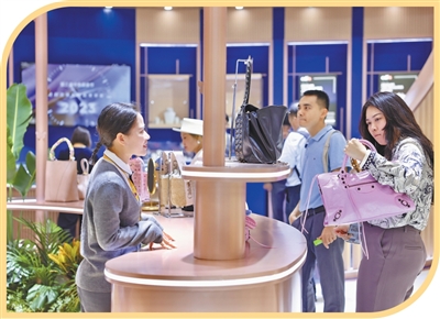消博會(huì)免稅與高端精品展區(qū),參展人員在選購(gòu)產(chǎn)品。