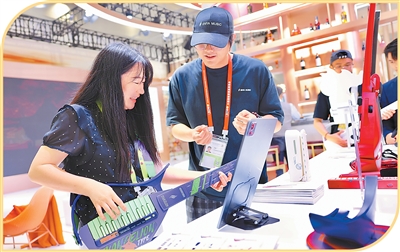參展人員在消博會(huì)免稅與高端精品展區(qū)體驗(yàn)賽博吉他。