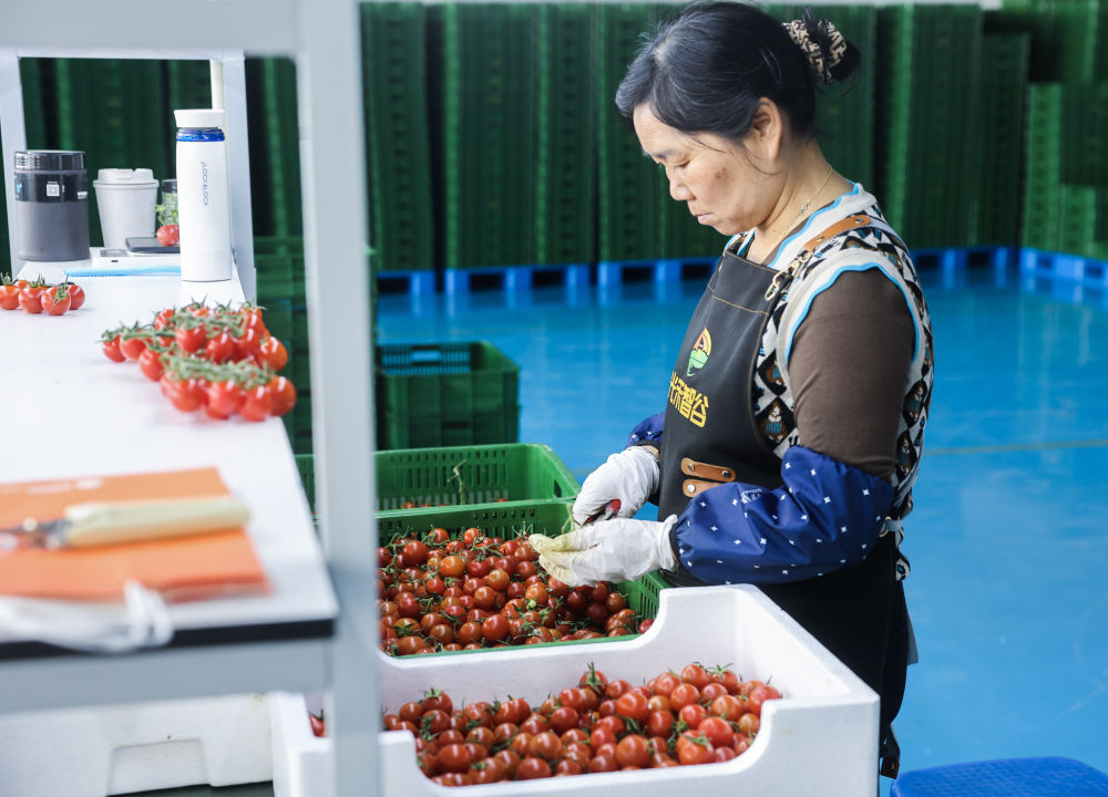 4月15日,村民在位于浙江省海寧市黃灣鎮的浙江光禾智谷生態農業有限公司車間內分揀、打包剛采摘下來的番茄。近年來,海寧市積極推進鄉村片區組團發展,助力鄉村振興。新華社記者徐昱 攝
