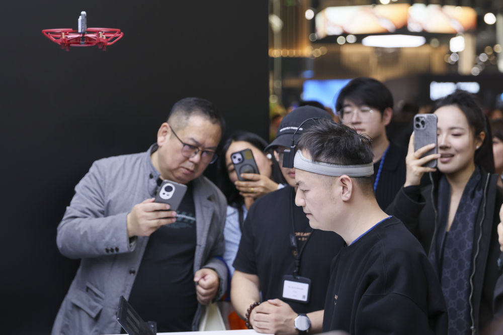 3月12日,在上海新國際博覽中心追覓科技展位腦機接口展臺,工作人員演示通過腦電波操作無人機。新華社記者王翔 攝