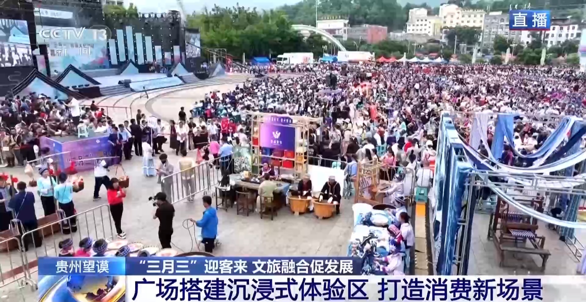 除了巡游展演外,這次望謨“三月三”活動中,在廣場搭建了互動體驗區,打造消費新場景,游客們可以分批進入現場體驗。這里展示的就是望謨紫茶的炒制以及沖泡技藝;蠟染制作體驗區,從織布到畫蠟再到浸染,全流程展現指尖上的藍白美學。在望謨,布依族“無糯不成席”。簸箕里“望謨三月三”歡迎您的字樣就是用五顏六色的糯米飯拼成的。用春天鮮嫩的楓香葉、綻放的密蒙花等植物染出艷麗的色彩,每一口都帶著春天的味道。