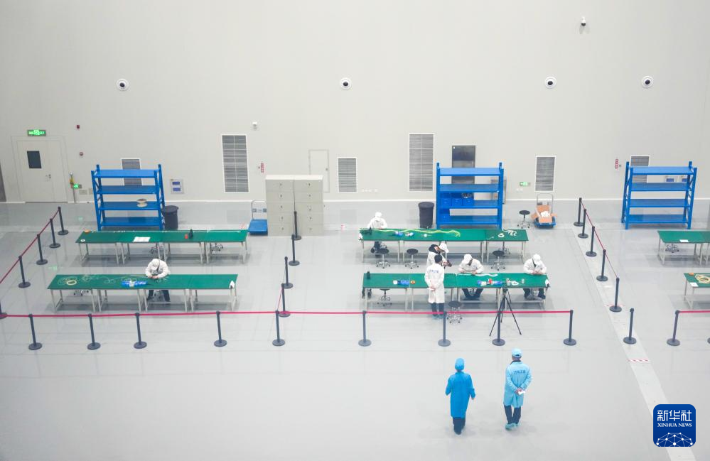 在濟南衛星產業發展集團有限公司總裝基地,工作人員在衛星生產車間工作(3月29日攝)。新華社記者 徐速繪 攝