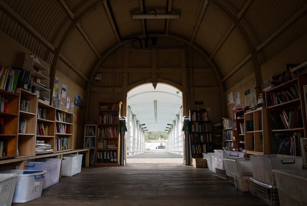 這是4月21日在澳大利亞悉尼市巴爾梅恩區泰晤士街盡頭的渡輪碼頭上拍攝的“泰晤士街圖書館”內景。新華社記者馬平攝