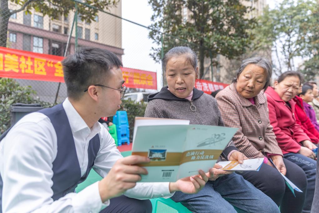 圖為重慶三峽銀行魚復支行的一名金融網格員在給轄區群眾宣講如何防范電信詐騙、防范非法集資。新華社記者 黃偉 攝