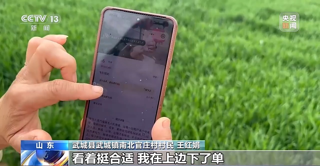 武城縣武城鎮南北官莊村村民 王紅娟:現在手機上有一個小程序,農藥、飛機噴灑都是明碼標價,看著挺合適,我在上邊下了單,不到半小時的時間就噴完了。
