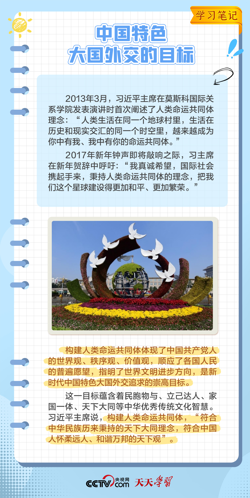 10年來,面對風云變幻的國際形勢,中國特色大國外交扎實推進,形成了全方位、多層次、立體化的外交布局,為我國高質量發展營造了良好外部環境。中國特色大國外交提出10周年之際,《學習筆記》特梳理其內涵要義,與您一同感悟其中蘊含的“中國智慧”。