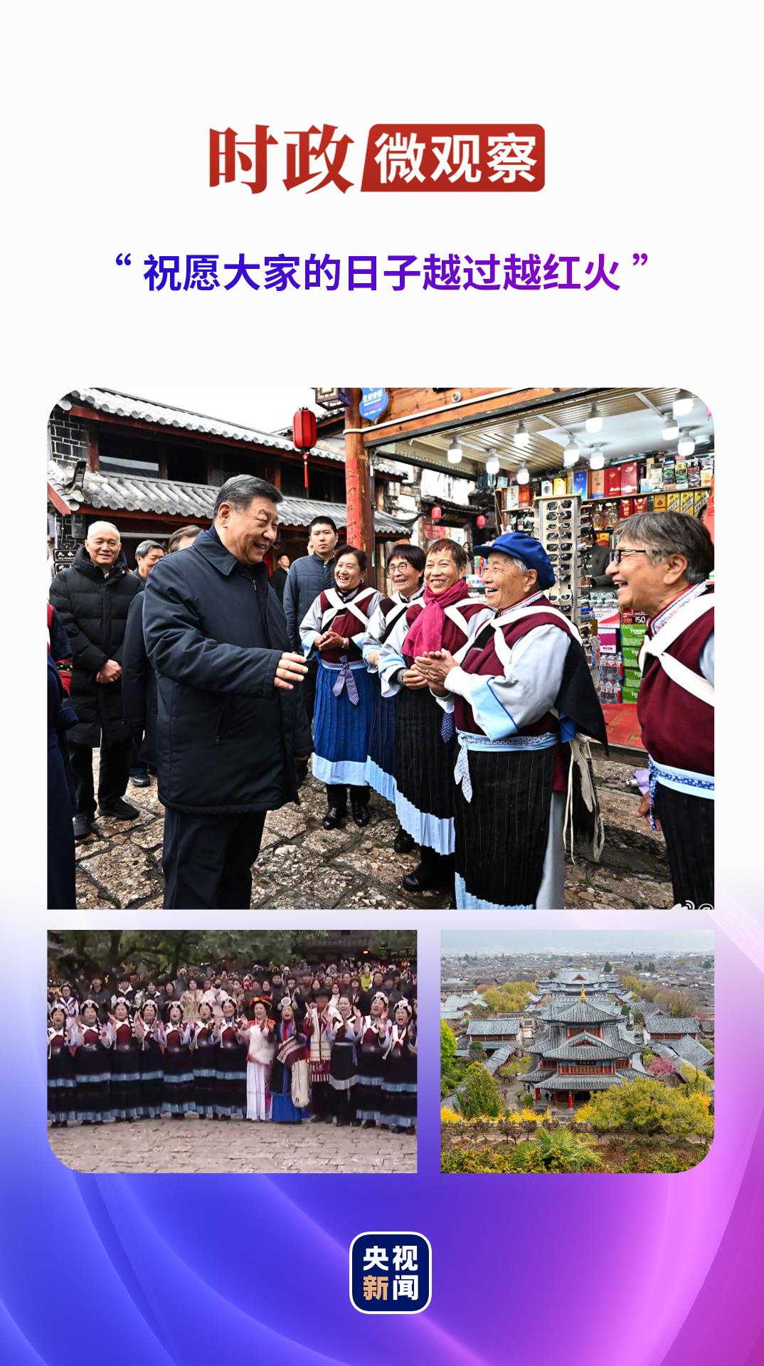 今年3月19日,習(xí)近平總書(shū)記再次來(lái)到云南考察,在麗江古城沿著石板路邊走邊看,不時(shí)停下腳步同大家親切交流。古城居民和游客見(jiàn)到總書(shū)記十分興奮,爭(zhēng)相問(wèn)好,有的還彈奏樂(lè)器、載歌載舞歡迎總書(shū)記。習(xí)近平總書(shū)記祝福大家,“希望你們的生活幸福安康,就像納西族的大姓‘和’姓一樣,和和美美”。