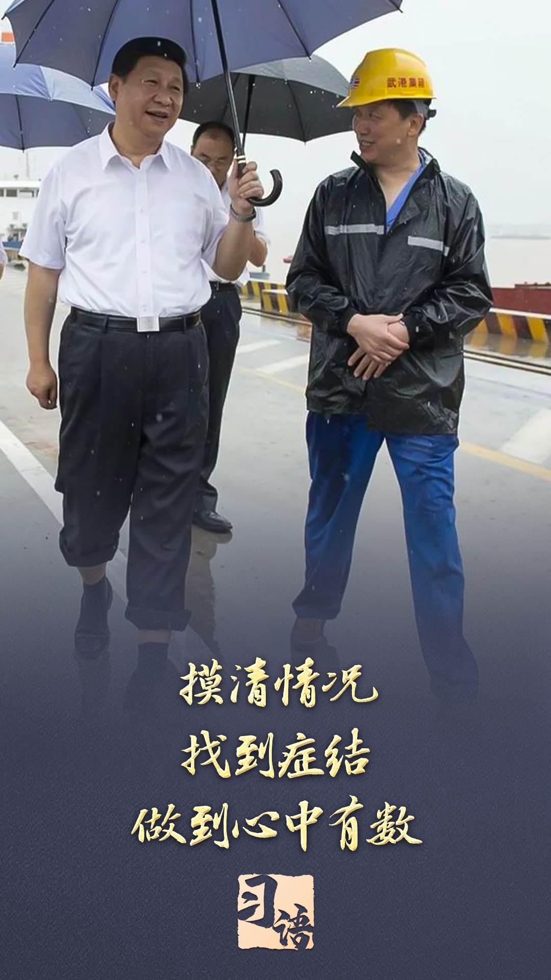 2013年7月,習近平總書記冒雨來到湖北武漢新港陽邏集裝箱港區考察,他卷起褲腿,打著雨傘,蹚著積水邊走邊看邊問。兩天后,在武漢主持召開部分省市負責人座談會時,習近平總書記強調:“研究、思考、確定全面深化改革的思路和重大舉措,刻舟求劍不行,閉門造車不行,異想天開更不行,必須進行全面深入的調查研究。”