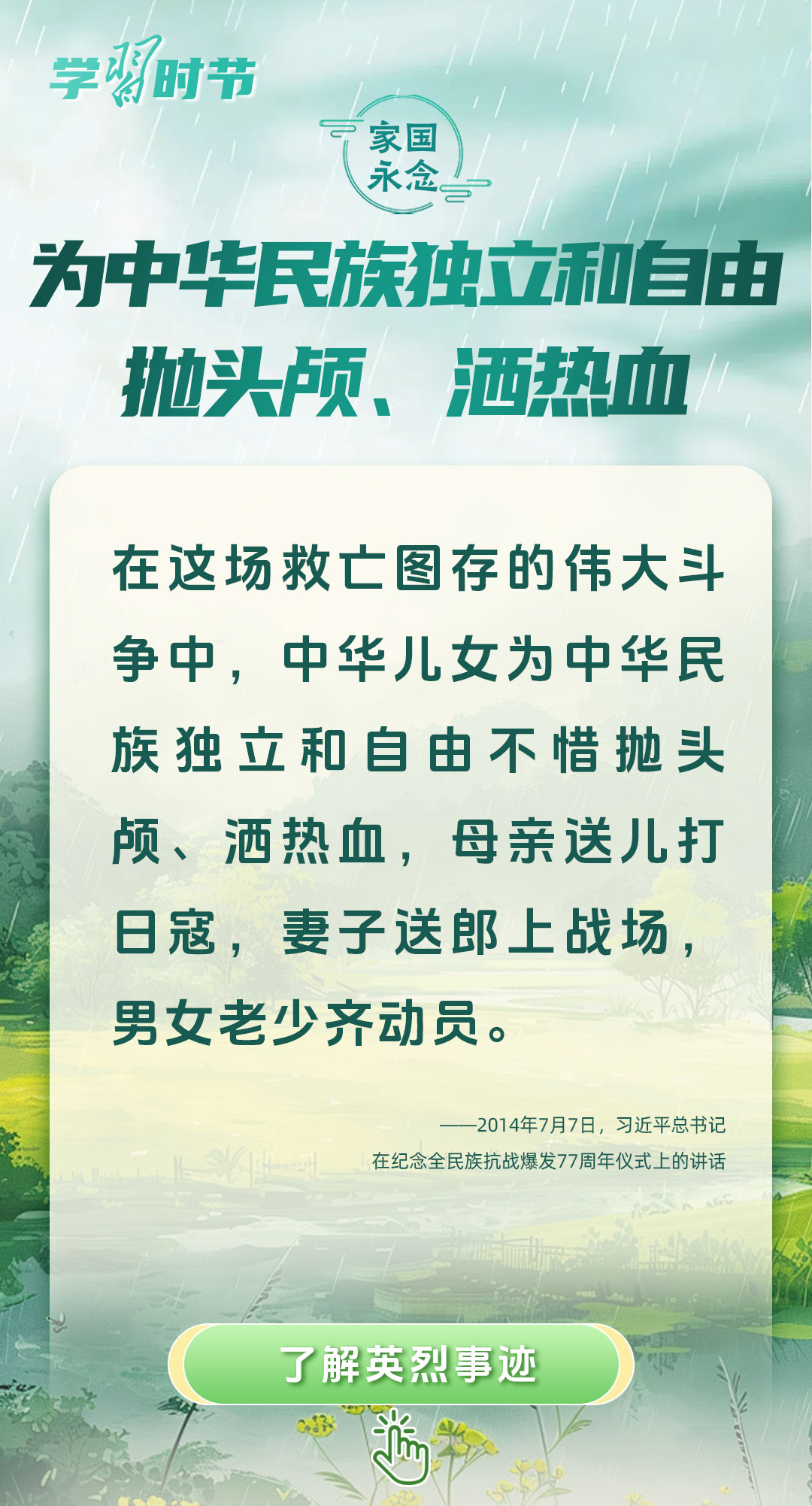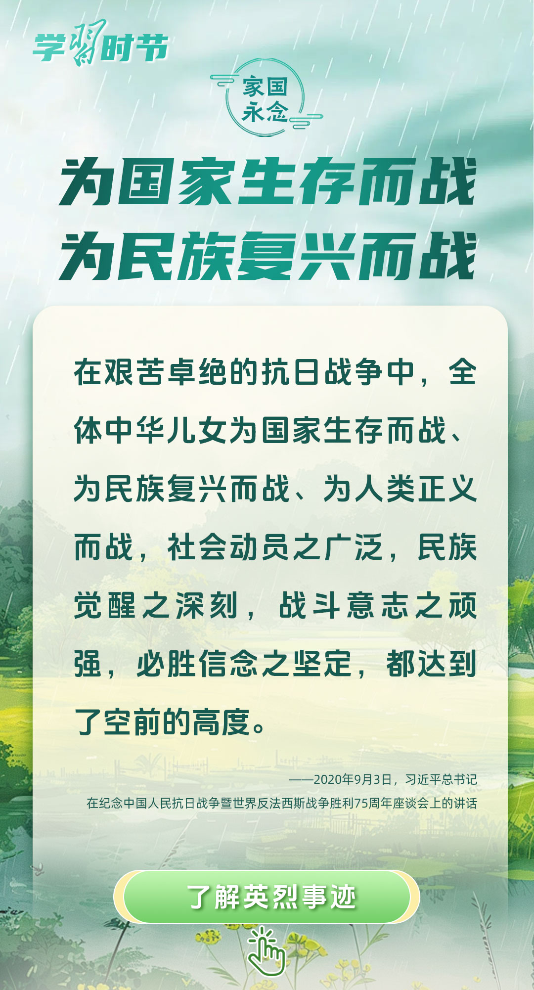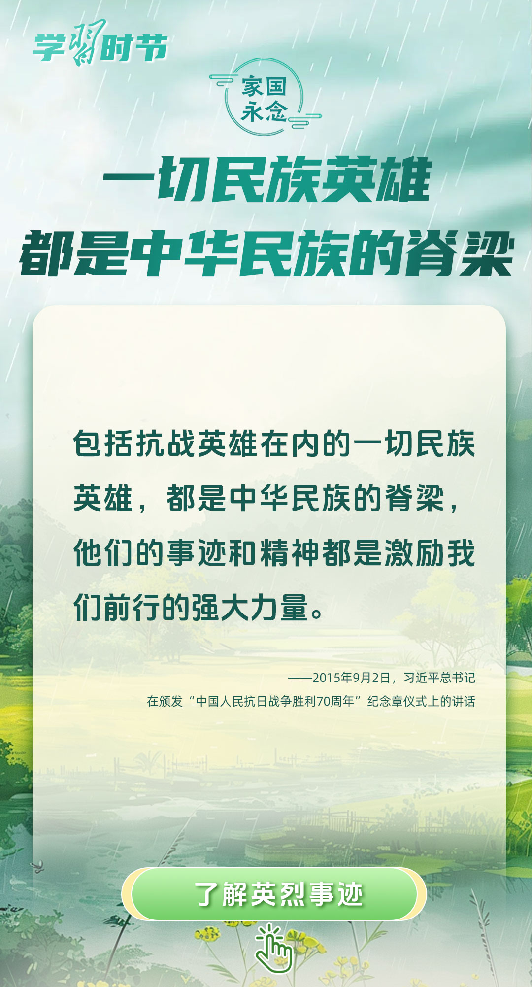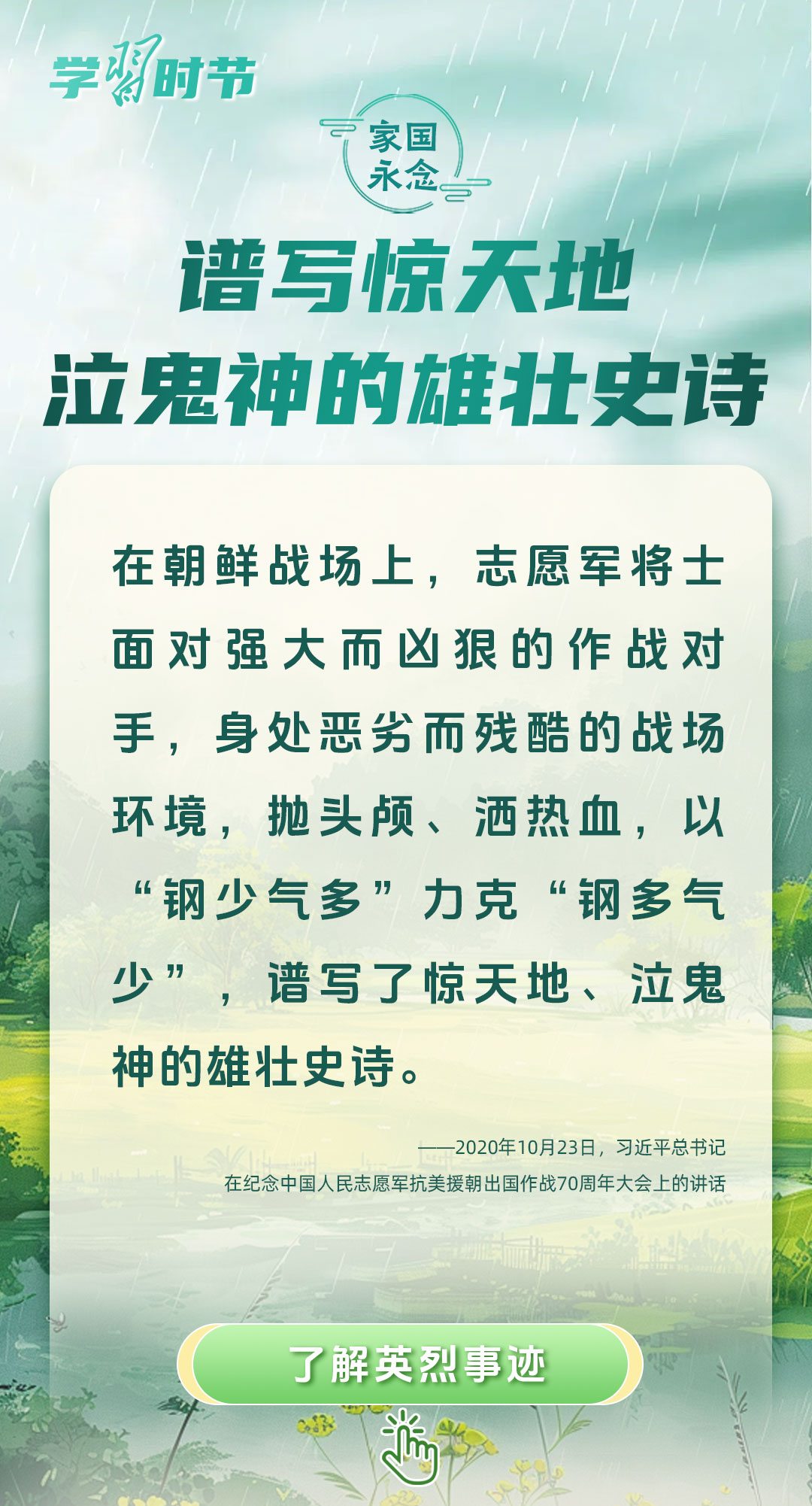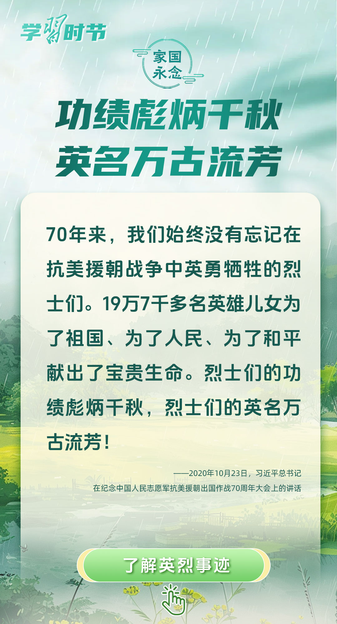 今年是中國人民抗日戰(zhàn)爭暨世界反法西斯戰(zhàn)爭勝利80周年、中國人民志愿軍抗美援朝出國作戰(zhàn)75周年。習近平總書記曾說:“對一切為國家、為民族、為和平付出寶貴生命的人們,不管時代怎樣變化,我們都要永遠銘記他們的犧牲和奉獻。”今天我們所擁有的一切,無不凝結(jié)著英雄、英烈們的奉獻付出乃至巨大犧牲。