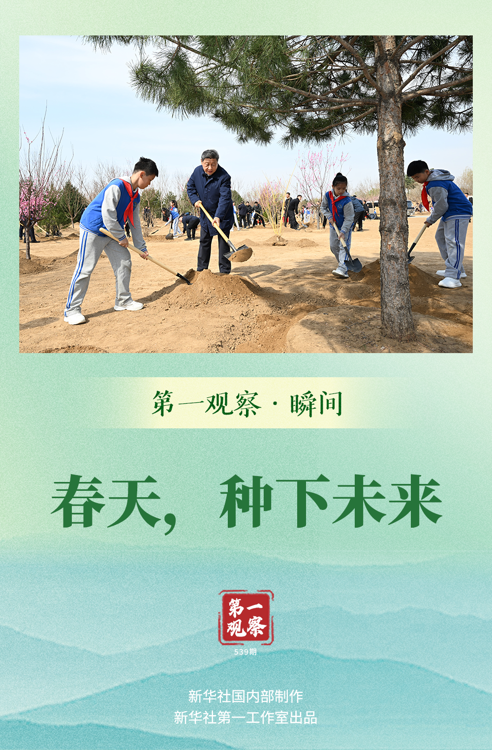 今天種下新綠,小小樹苗將長成參天大樹、連片成林,祖國大地綠意盎然、生機勃發。今天播撒希望,孩子們終將成為社會發展的棟梁之才,強國建設、民族復興更有接續奮斗的力量。