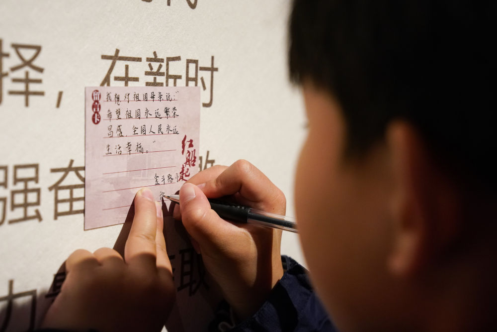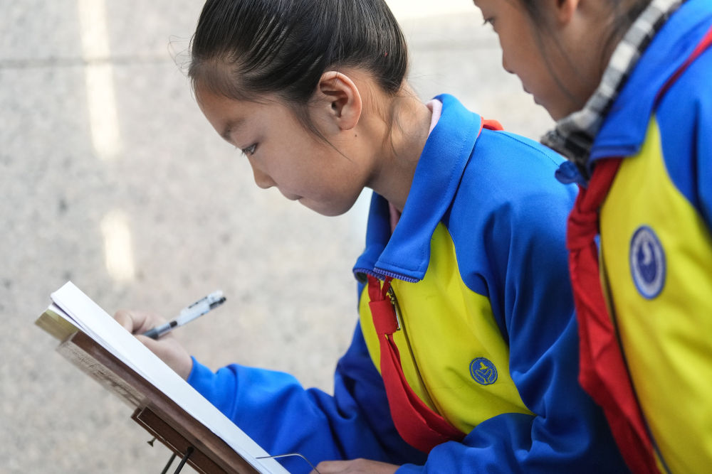 2025年3月27日,安徽省合肥市金斗路小學的學生在渡江戰役紀念館書寫留言卡。