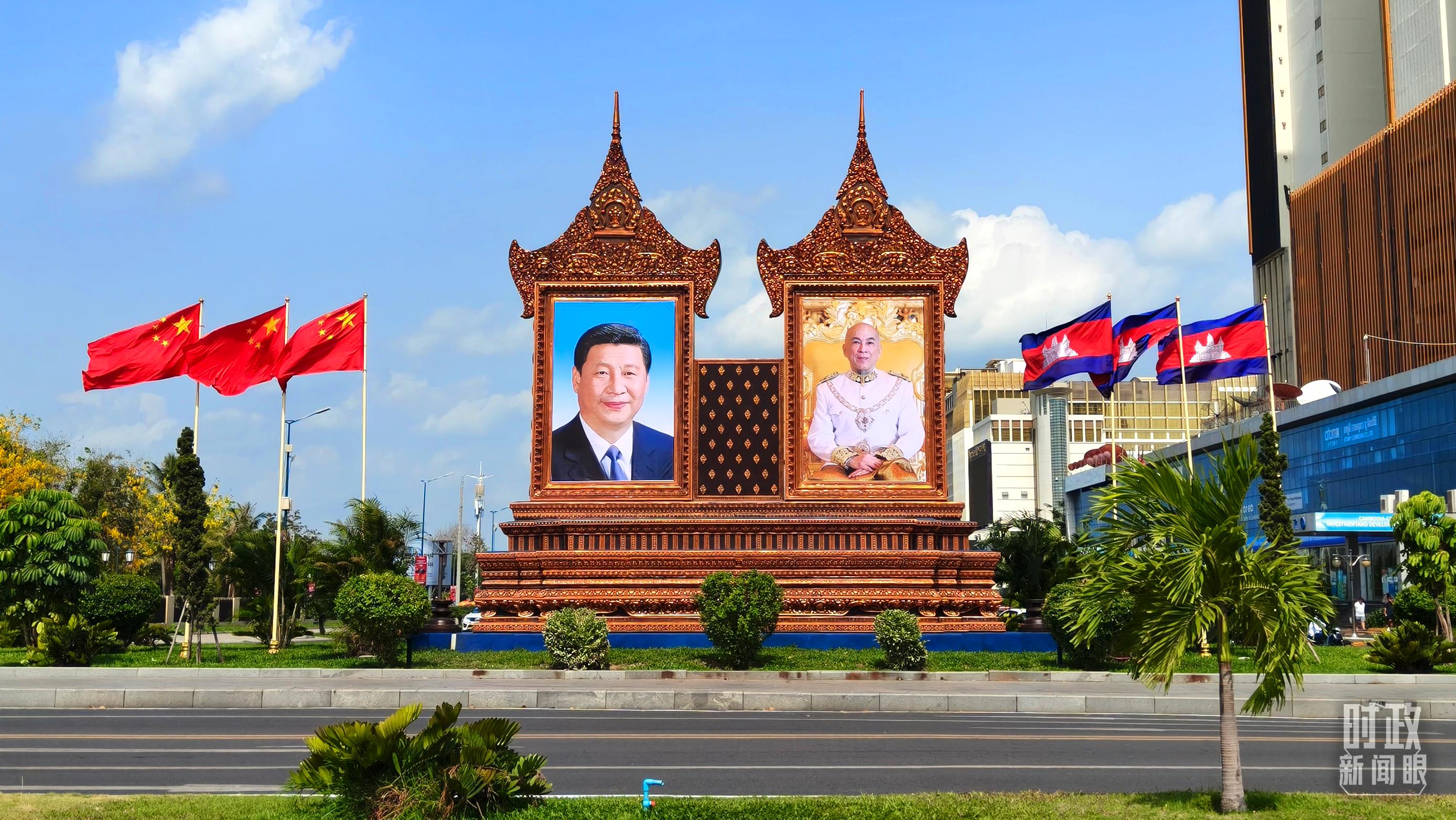 金邊街頭的巨幅兩國領導人照片和兩國國旗。(總臺央視記者陸泓宇拍攝)
